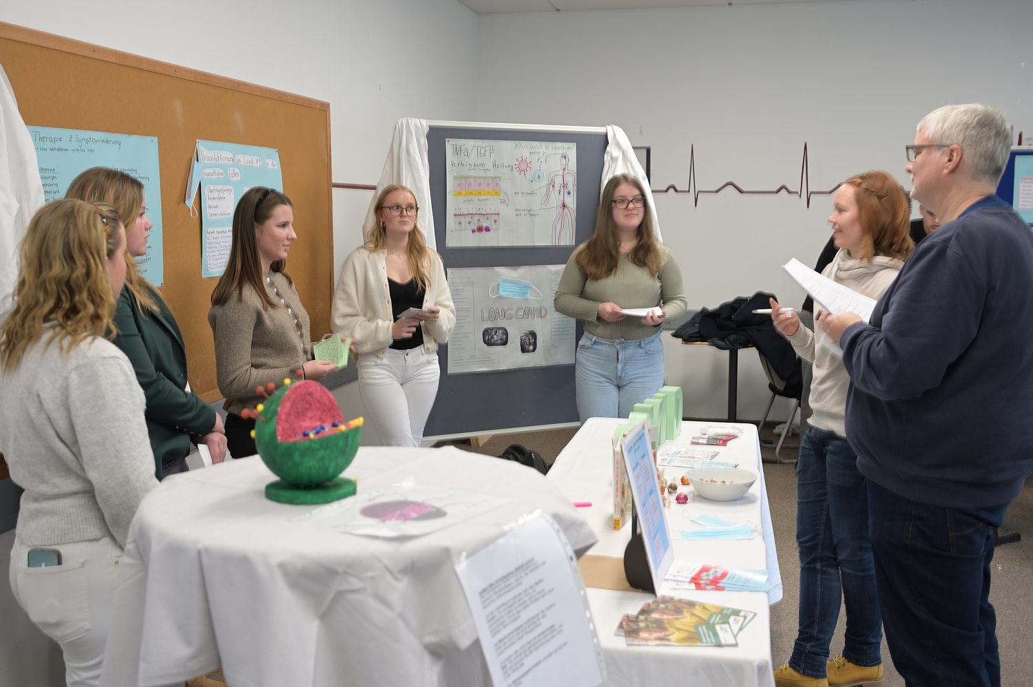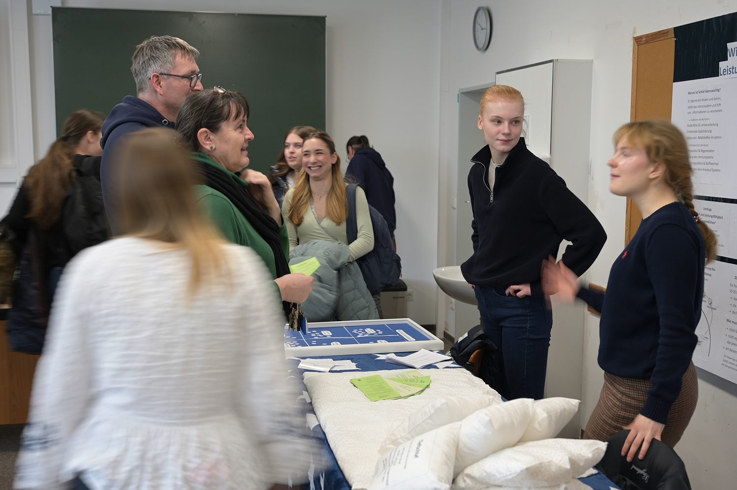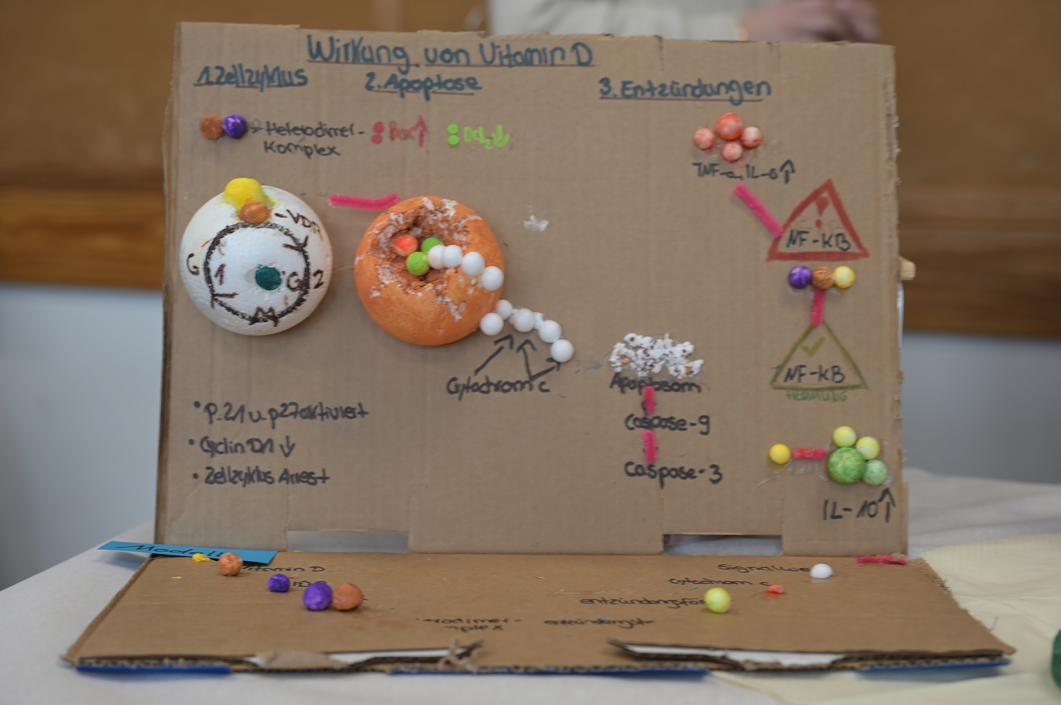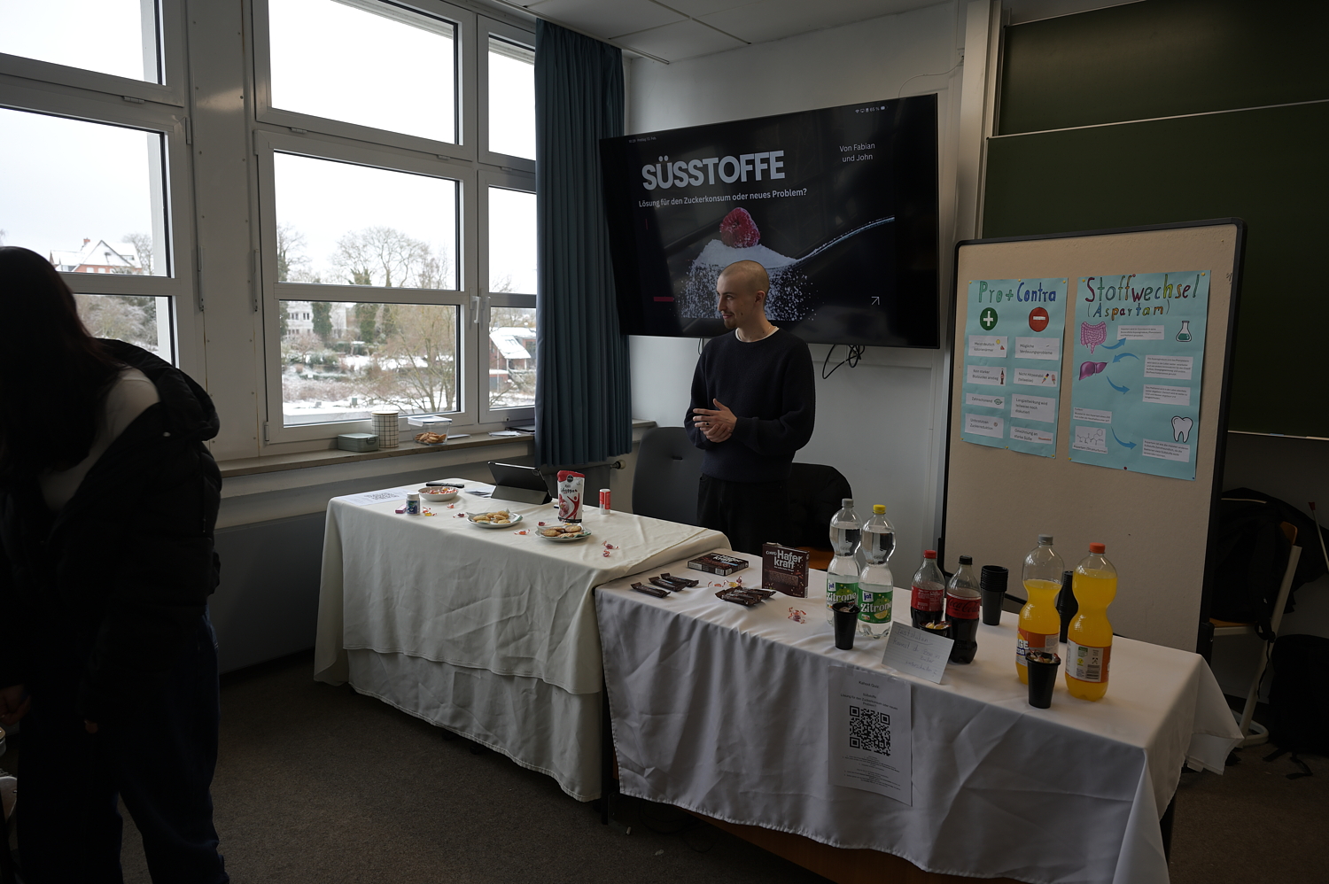 So wurden die Besucher informiert über die Wirkung von Vitamin D, ein Raketen-StartUp, Seegras als nachhaltigen Werkstoff, Schlafforschung, verschiedene Bio-Siegel, »KI« im Gaming, Arten und Wirkungen von Süßstoffen, Demenz, Stuhltransplantationen, Covid / Long Covid und vieles mehr – eine beeindruckende Vielfalt an Themen, vorgestellt von souverän auftretenden Schüler*innen als Expert*innen für ihr jeweiliges Fachgebiet.