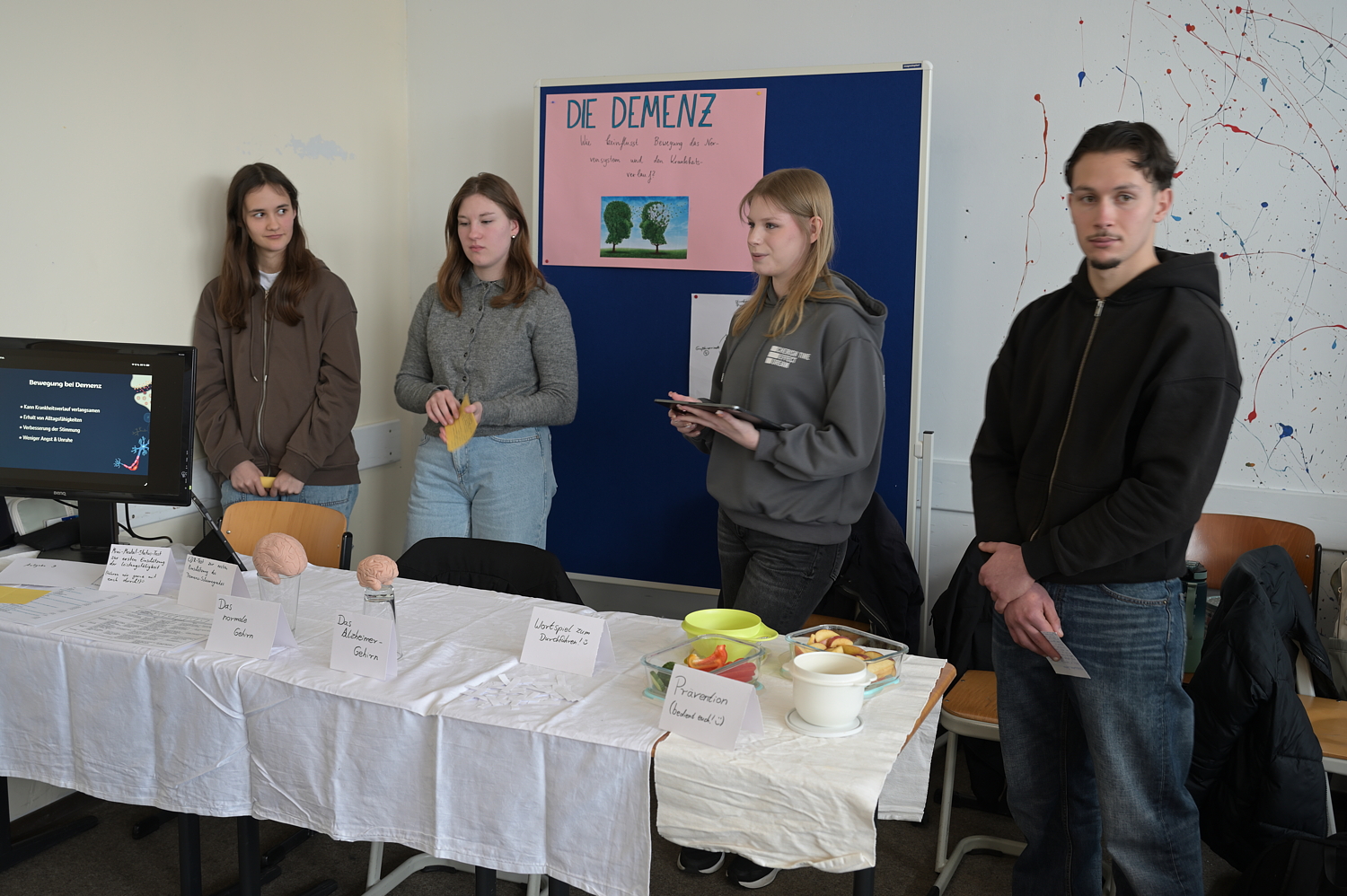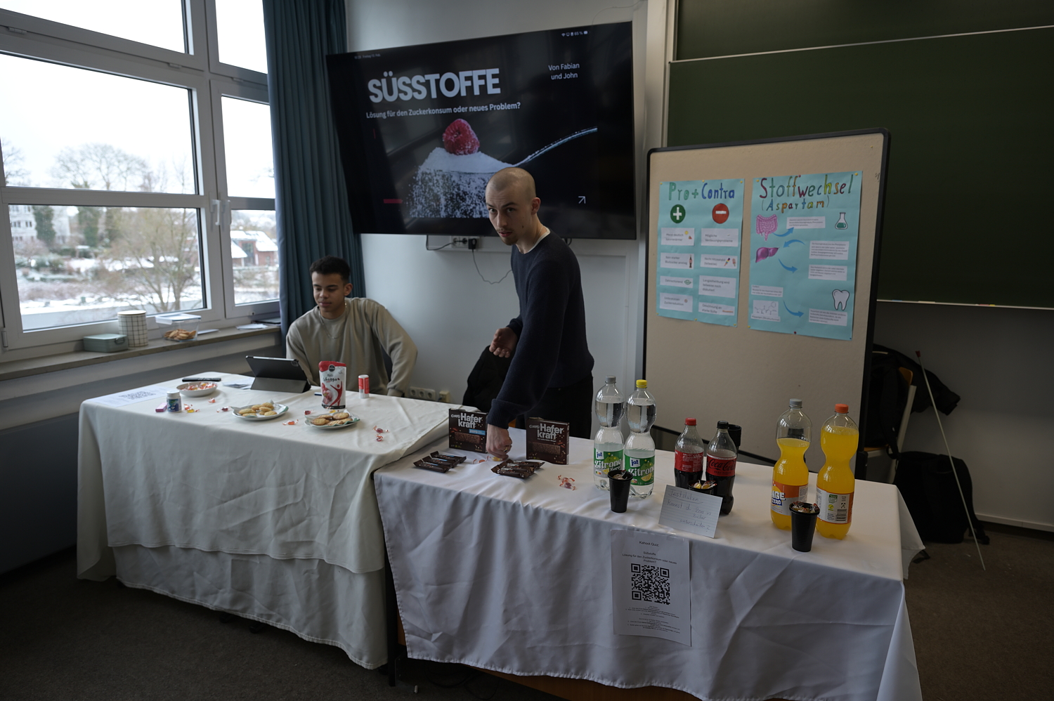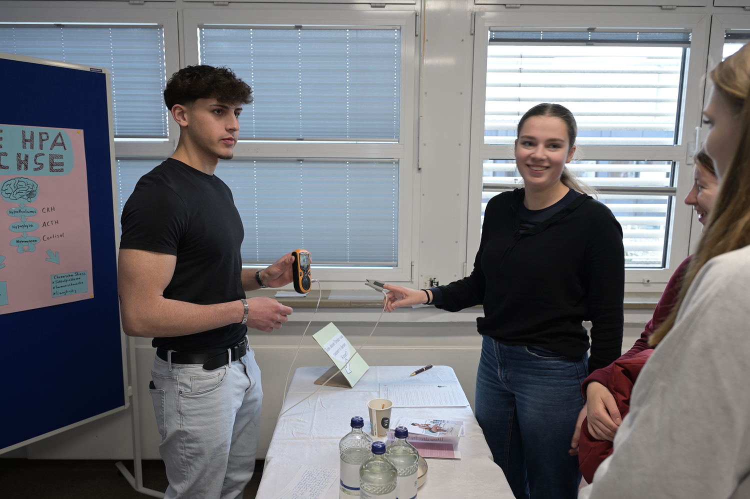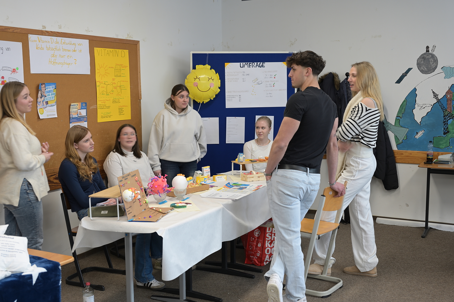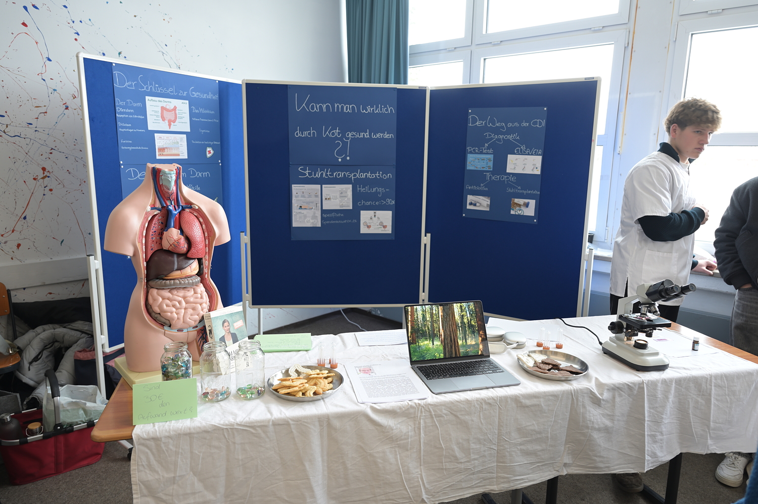 So wurden die Besucher informiert über die Wirkung von Vitamin D, ein Raketen-StartUp, Seegras als nachhaltigen Werkstoff, Schlafforschung, verschiedene Bio-Siegel, »KI« im Gaming, Arten und Wirkungen von Süßstoffen, Demenz, Stuhltransplantationen, Covid / Long Covid und vieles mehr – eine beeindruckende Vielfalt an Themen, vorgestellt von souverän auftretenden Schüler*innen als Expert*innen für ihr jeweiliges Fachgebiet.