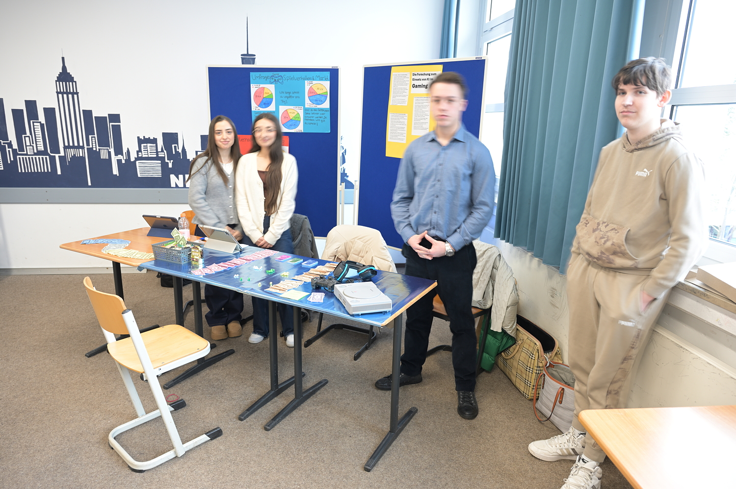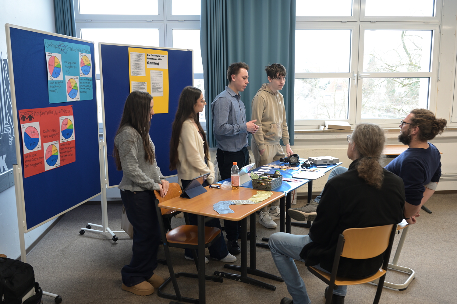 Unter dem übergreifenden Thema »Forschung« haben Schüler:innen des 12. Jahrgangs in der Projektwoche in Kleingruppen an selbstgewählten fachrichtungsspezifischen Fragestellungen gearbeitet und die Ergebnisse in Form einer Messe am Freitag präsentiert.